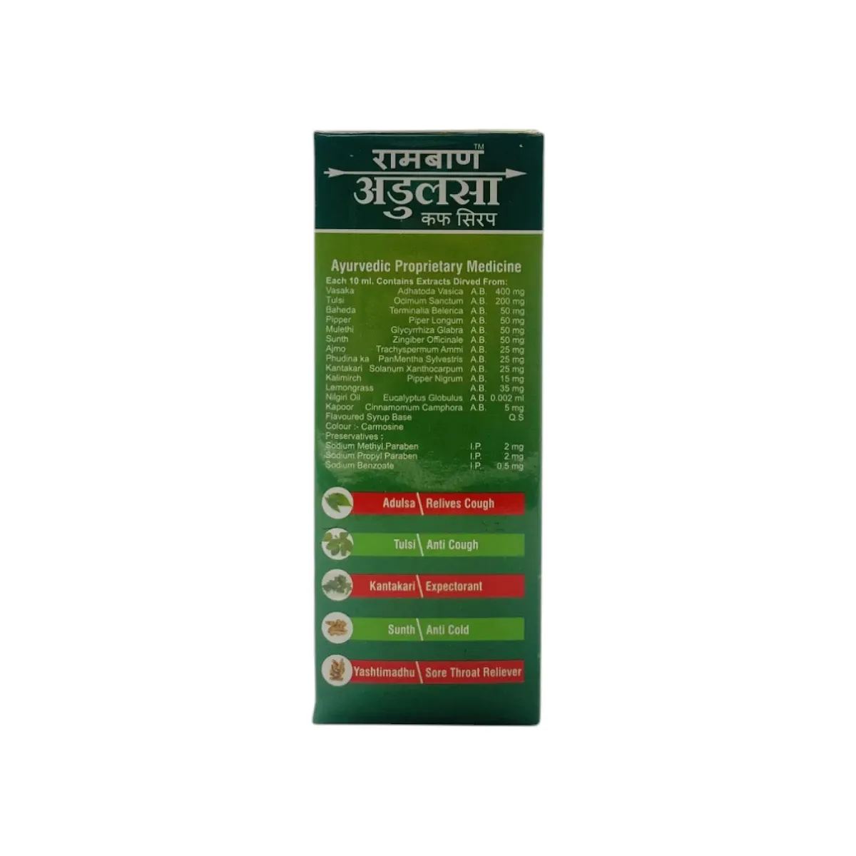 Ramban Adulsa Syrup is an herbal or Ayurvedic remedy that is primarily used to provide relief from sore throats and other respiratory discomforts, often associated with colds and coughs. This syrup is known for its soothing properties and is formulated using Adulsa (also known as Vasa or Adhatoda vasica), a well-known herb in traditional medicine, along with other herbal ingredients to promote respiratory health.