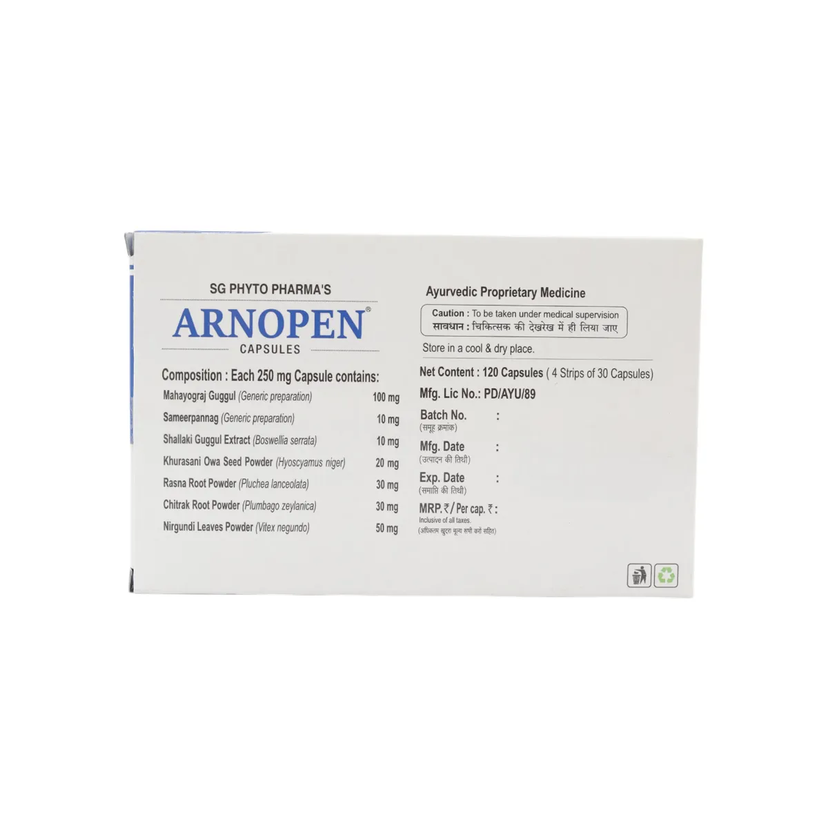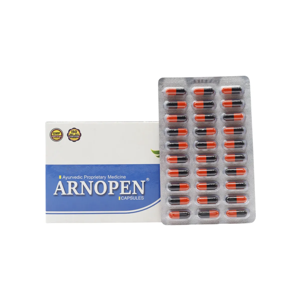 Arnopen Capsules are an Ayurvedic medicine specifically designed for the treatment of rheumatoid arthritis. These capsules offer natural relief from the symptoms of arthritis, such as joint pain, stiffness, and inflammation. Arnopen works by using traditional Ayurvedic ingredients known for their anti-inflammatory and pain-relieving properties, making it an effective solution for managing rheumatoid arthritis. This herbal formulation helps improve joint mobility and overall comfort, providing a natural alternative for those seeking relief from arthritis symptoms.
