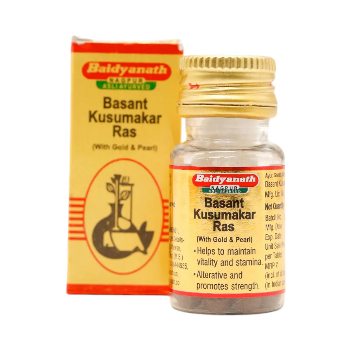 Baidyanath Basant Kusumakar Ras with Gold Tablets is an excellent Ayurvedic solution for the management of high blood sugar levels and diabetes. This product has properties that are effective in protecting the body from various problems such as polyuria caused due to diabetes. It protects and nourishes the body and helps build strength.