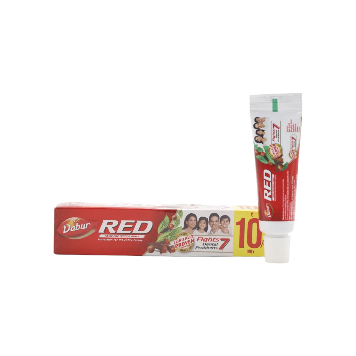 DABUR RED PASTE has a clinically proven formula that fights against 7 DENTAL PROBLEMS: 1) Toothache, 2)Cavities, 3) Plaque, 4) Germs, 5) Bad Breath, 6) Yellowing, and 7) Bleeding Gums. It is fluoride free and made with 13 potent ayurvedic ingredients including Pudina Satva that provides fresh breath, Laung ka Tail that relieves toothache, Shunthi that has anti-inflammatory and antibacterial properties, and Tomar Beej that has antiseptic and antibacterial properties.